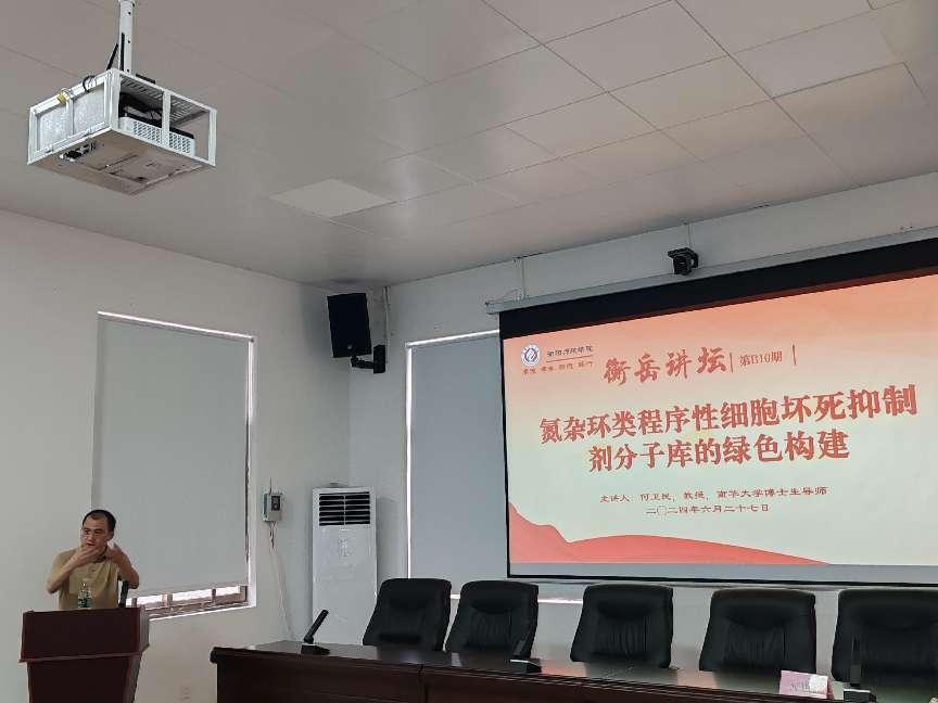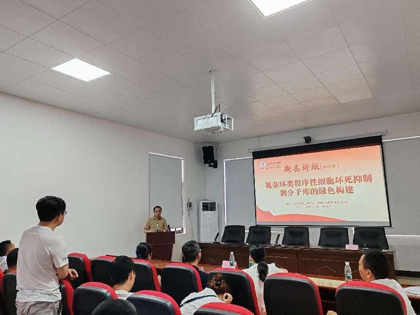 随后,何卫民教授以《氮杂环类程序性细胞坏死抑制剂分子库的绿色构建》为题开展讲座。何教授首先从自由氮杂环类化合物库的研究背景为切入点,引入抗炎新药的研发,并介绍了课题组的研发路径与亮点。接着,何教授从新热点程序性细胞坏死抑制剂出发,结合自己课题组的研究基础,详细、专业地介绍了如何绿色构建含氮杂环分子库。通过介绍,我们也了解到何教授在这方面研究成果众多且受到同行的高度评价,深切地感受到了一个资深学者的科研魅力。