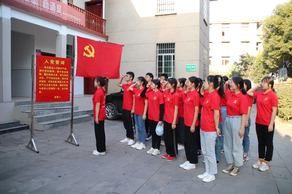 随后,学生党员杨涵带领新党员于湖南衡山农民运动纪念馆内宣誓。列队肃立,大家举右手齐肩握拳,跟随领誓人齐声宣誓,铿锵有力的发声表明了自己对党组织的赤诚决心。