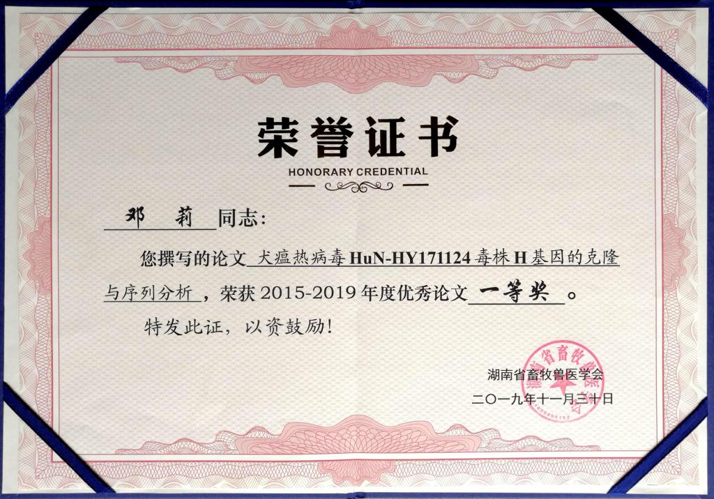 今年是新中国成立70周年,为激励大家在新的起点上取得更大进步,大会评选了2015-2019年度优秀学术论文。我校2016级生物科学专业学生邓莉撰写的论文《犬瘟热病毒HuN-HY171124毒株H基因的克隆与序列分析》荣获一等奖。