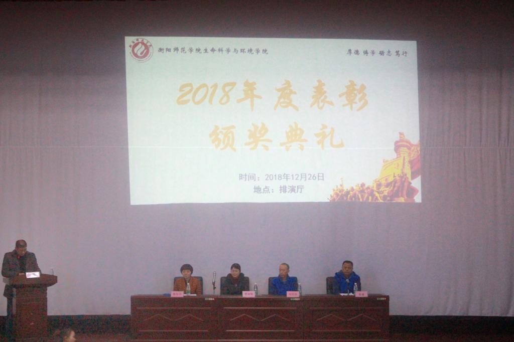 接着,副院长易诚宣读获奖名单,颁奖嘉宾为获奖学生颁奖。2016级环境工程一班、2017级生物科学二班荣获“先进班集体”荣誉称号;B04-1-402-2等17个宿舍被评为学院“文明和谐宿舍”;阳美荣获2018年“校优秀学生干部标兵”称号;董安婷、刘贤妹等68名学生分别被评为2018年“校三好学生”、“校优秀学生干部”;秦永强、邓婷芬等44位学生分别被评为学院“卓越团学干部”、“卓越学生干部”。