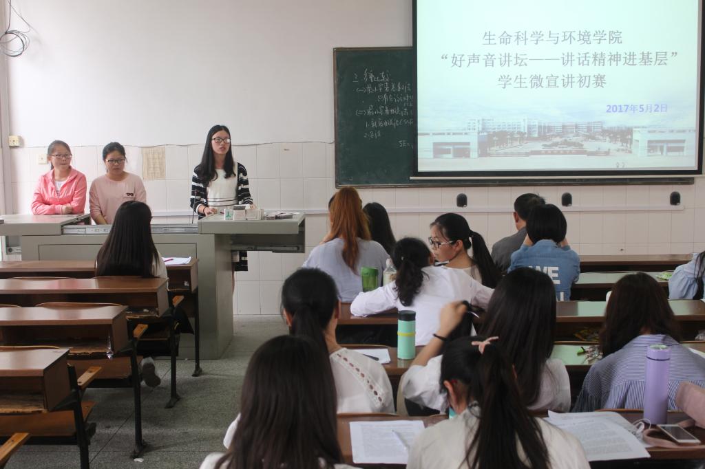 5月11日晚19时,“好声音讲堂-讲话精神进基层”师生微宣讲比赛学生组决赛在东校区音乐厅举行。生命科学与环境学院3支代表队结合自身学习和生活实际,用富有感染力的表达、鲜活真实的事例和充满激情的语言,从不同角度诠释对“习近平总书记系列重要讲话精神”的深刻理解,赢得了观众的热烈掌声。经过激烈地角逐,我院15级生物科学1班荣获三等奖,15级生物科学2班、15级环境工程1班荣获优胜奖。