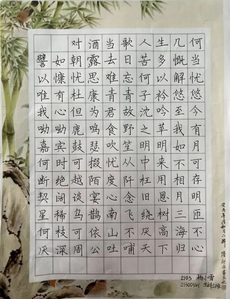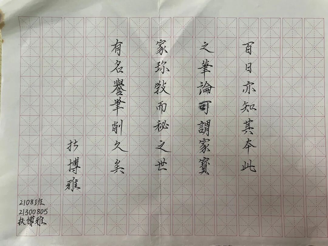 在日常教学中,教师的板书就是学生典范,一笔一画都给学生起着榜样作用。我院始终注重师范生的书法,科技创新卓越师范班的同学们在开课期间认真学习书法,交上来的作品各具特色,或舒展大方、清秀雅致,或苍劲有力、入木三分,看起来韵味十足,展现了扎实的书写基本功。