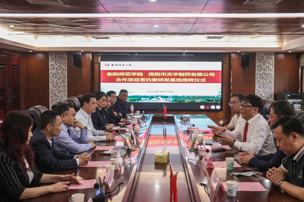 4月29日上午,德赢Vwin官方区域合作伙伴与南阳市天华制药有限公司合作项目签约暨研发基地授牌仪式在办公楼二会议室举行。校长皮修平、南阳市天华制药有限公司董事长王峰、副总裁孙国印等一行四人出席会议,副校长魏晓林主持会议。