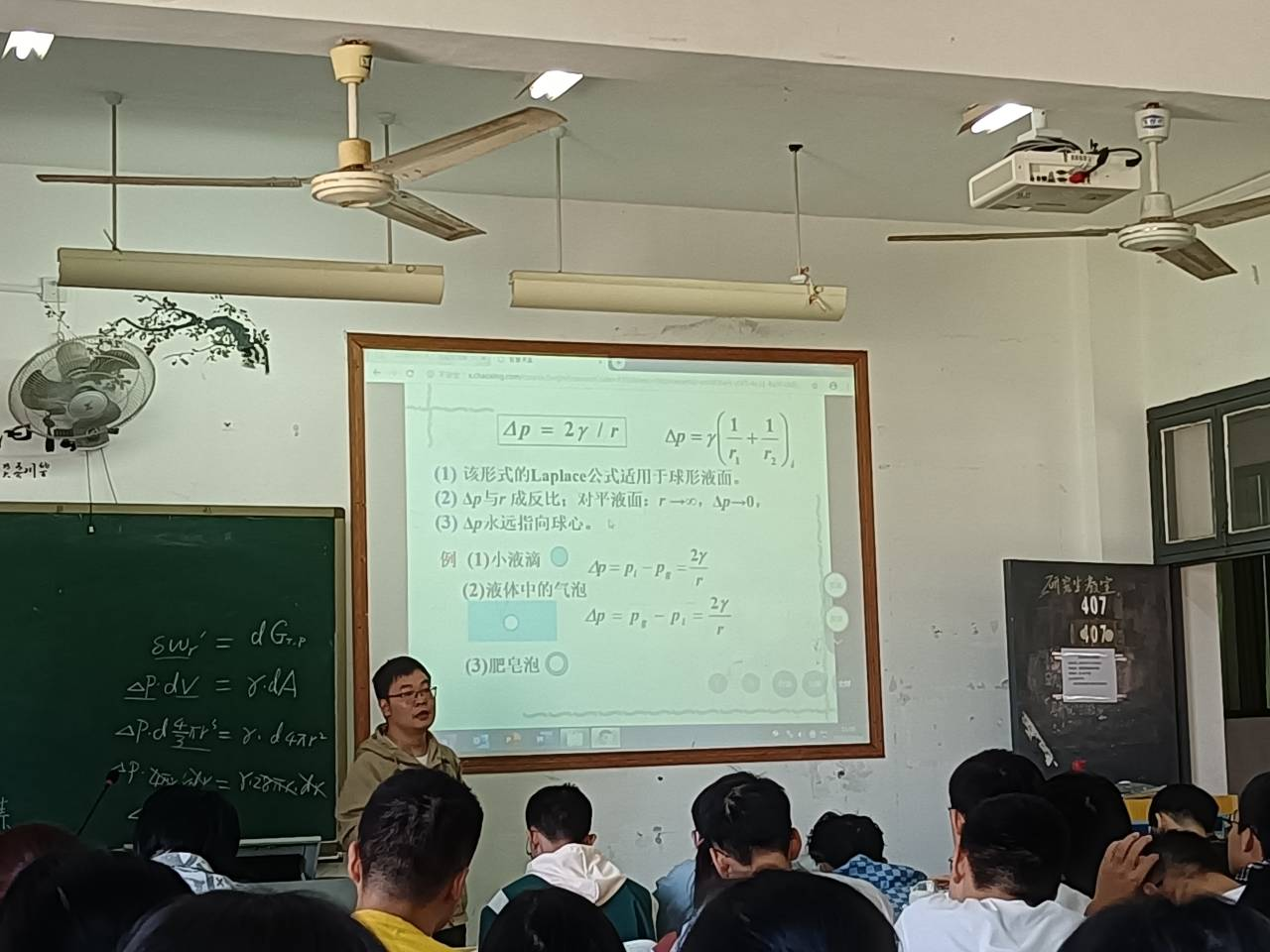 罗远来老师的《物理化学》课堂,则是另外一番风景。罗老师以上一次课堂教学内容为引线,帮助同学们逐个梳理知识点,并将知识点串联起来,形成一张仍存“缺位”的知识网络。新课讲授则从“补缺”开始,生动形象地运用实例来帮助同学们更好地理解界面张力和弯曲液面的附加压力,将缺位的知识点补齐。罗远来老师的课堂逻辑严谨,图文并茂,氛围活跃。