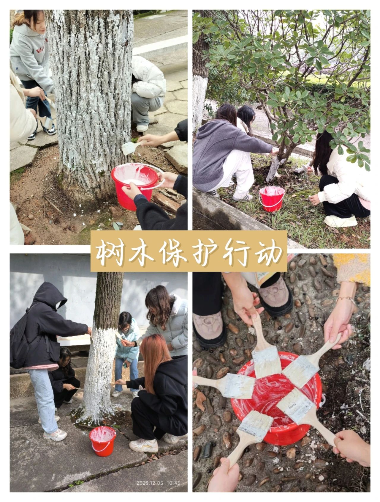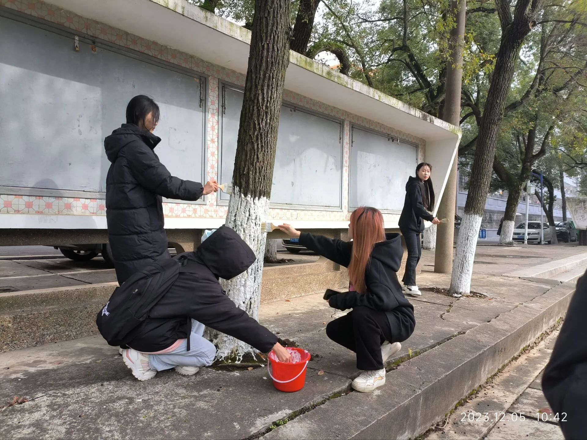 活动内容:志愿者们为德赢Vwin官方区域合作伙伴西校区校园内的树木涂抹石灰水,为其防虫、保暖。