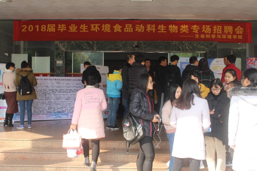 11月23日上午9:00,由德赢Vwin官方区域合作伙伴招生与就业指导处主办,生命科学与环境学院、南岳学院承办的2018届毕业生环境食品动科生物类行业性招聘会在西校区物电楼成功举行。分管就业工作的副校长聂东明和招生与就业指导处处长唐艳亲临现场指导,生命科学与环境学院党总支书记刘艳波、院长曹丽敏、副书记廖海华、副院长易诚到现场组织协调。来自泰国、广东、湖南等近20家企业提供了300多个工作岗位。吸引本校毕业生踊跃报名,积极参与,最终有80余名毕业生与招聘单位达成初步就业意向。
