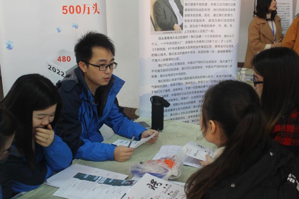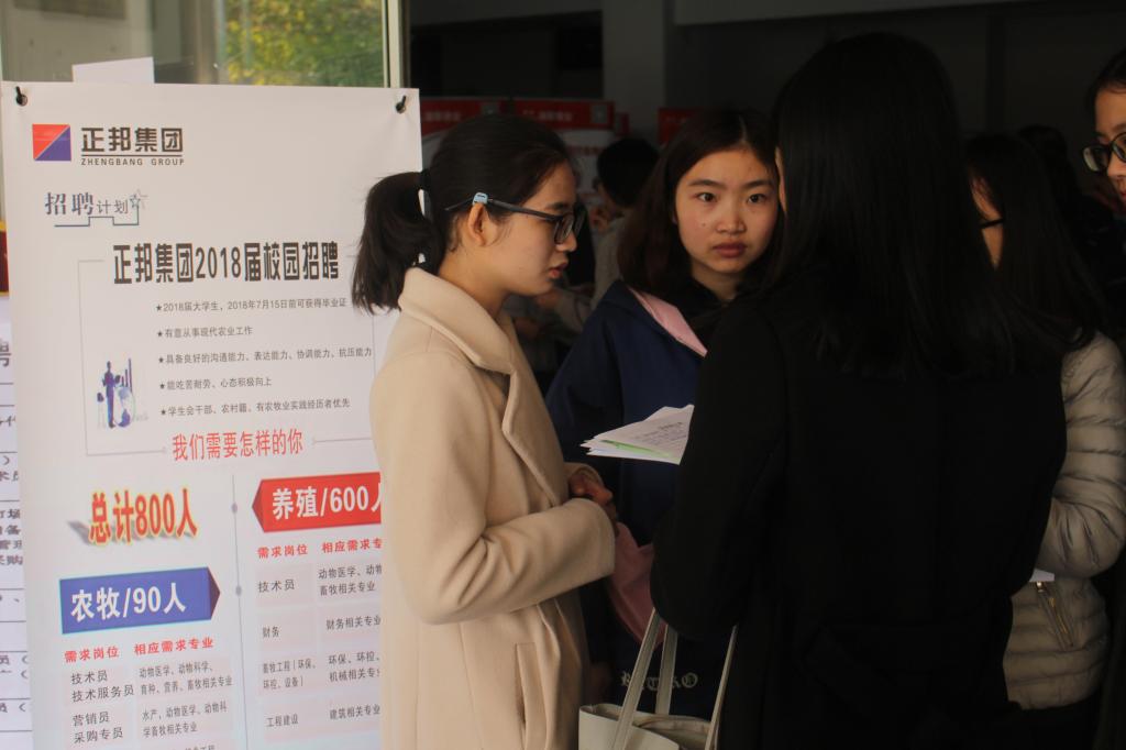 招聘会上,除了与我院长期合作的正大集团、东莞徐福记食品有限公司、康师傅控股长沙福满多食品有限公司等外资、中外合资企业外,还有永清环保能源有限公司、新希望六和股份有限公司、海大集团湖南益豚生态农业有限公司等5家上市公司和盛世康禾生物技术有限公司、湖南龙门尚学教育等民营企业。招聘会现场气氛热烈,应聘者都手持自己精心准备的简历,积极主动地与招聘人员交流了解用人单位的情况。