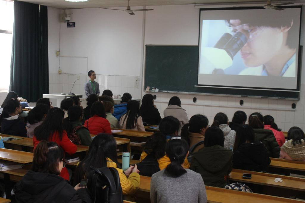 今年招聘岗位多,招聘咨询台前学生络绎不绝。工作人员在介绍本公司的基本情况后,耐心解答同学们询问的事项,并沟通了解应聘者的基本情况和就业意向。招聘会期间,我院组织了7场企业专场宣讲会。企业人事主管们通过播放公司宣传片和PPT,介绍企业特色与人才需求、薪资待遇,并表示非常欢迎求职者前来应聘工作。海大集团湖南益豚生态农业有限责任公司还在生命科学与环境学院设立“海大益豚专业奖学金”,并在此次招聘宣讲会现场举行了颁奖典礼。以此鼓励我校人才培养,切实加强校企合作。浓烈的就业氛围吸引了大量非毕业班学生前来驻足聆听,这也为他们提前了解企业招聘流程,制定人生职业生涯规划提供了良好的学习实践平台。