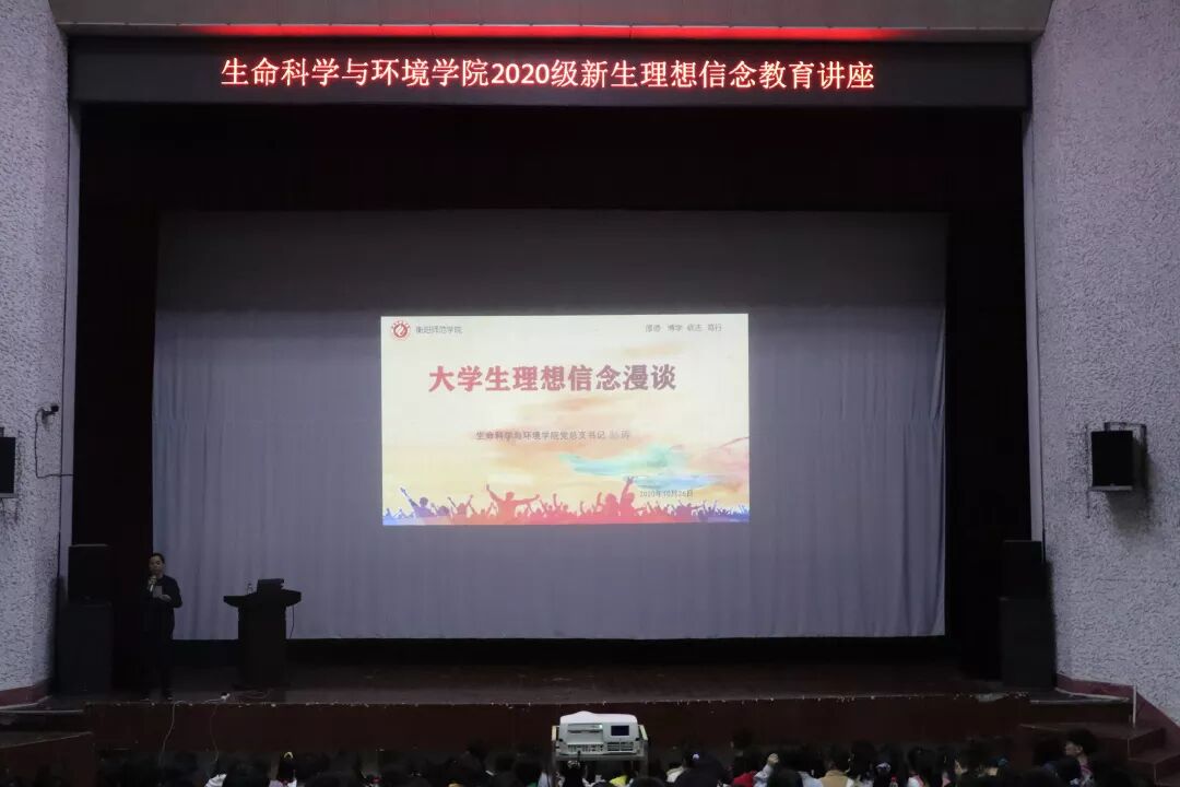 10月26日晚七点,生命科学与环境学院于西校区排演厅举办新生理想信念暨《学生手册》教育讲座。我院党总支书记彭晖,辅导员老师唐乾翔任讲座主讲人。生环院20级全体学生到场聆听。