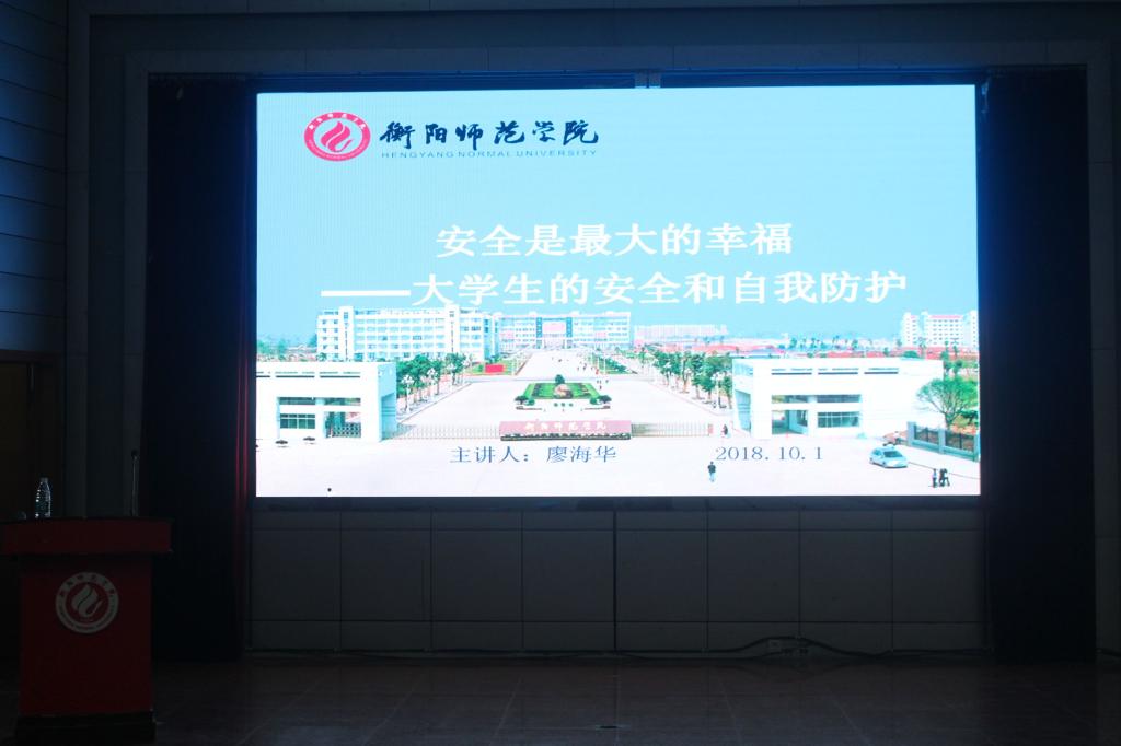 10月1日晚19点,生命科学与环境学院2018级全体新生在西校区模拟法庭聆听《大学生安全与自我保护》主题教育讲座。我院党总支副书记廖海华,团委书记刘树芬,辅导员老师许若霏、黎琦莅临讲座。