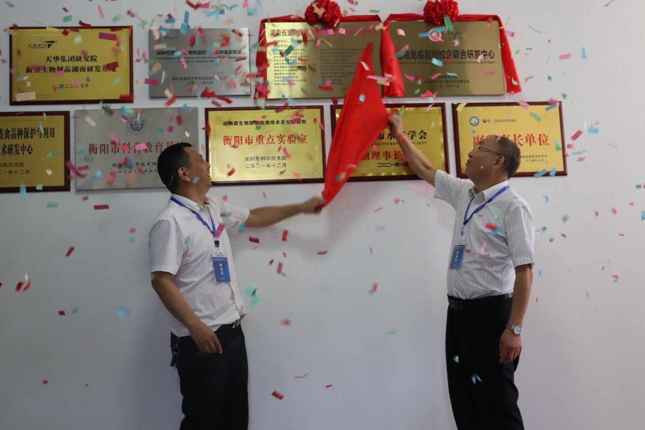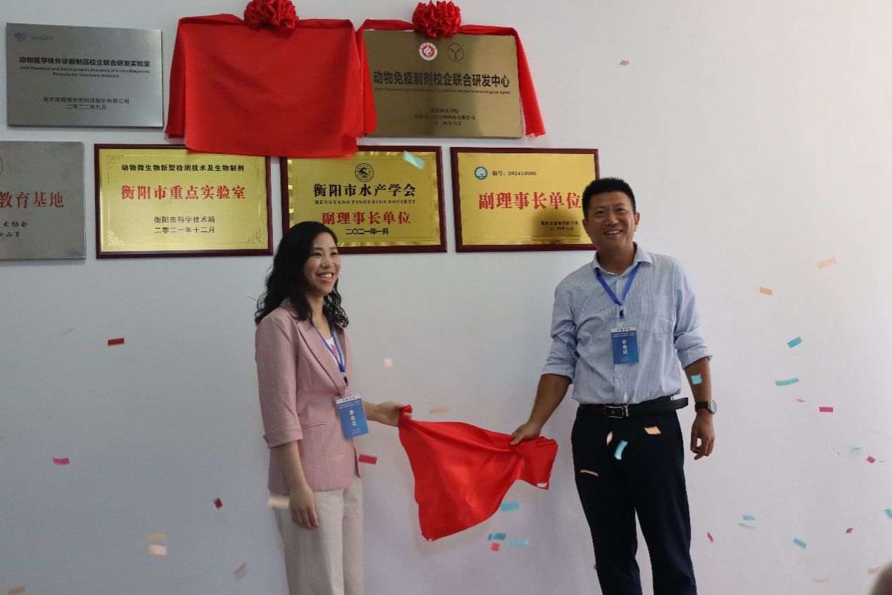 陈晓华副院长和周家兴先生共同为“动物免疫制剂校企联合研发中心”揭牌