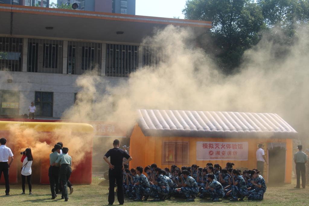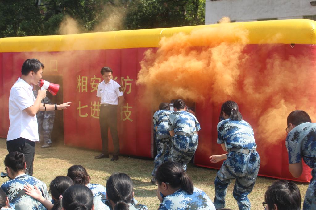 上午9:00,消防宣传公益人员到达操场,并准备好演练相关设备,同时有宣传人员进行安全知识讲解。宣传人员表示发生火灾时大部分人的意识薄弱与错误行为是人员伤亡重要原因。接着宣传人员列举了几种常见的情况,介绍了在面对不同情况下的不同方法,举出力所能及的有效措施。重点教学了在发生火灾后学生如何自救逃生,熟悉消防器材的使用和如何扑灭初起火灾。提出了同学们应该需要有一定的防范的意识以及住校时的注意事项。随后,新生自主体验在田径场浓烟中的逃生方法,同学们不慌不忙,以理智、迅速的行动完成了此次演练。