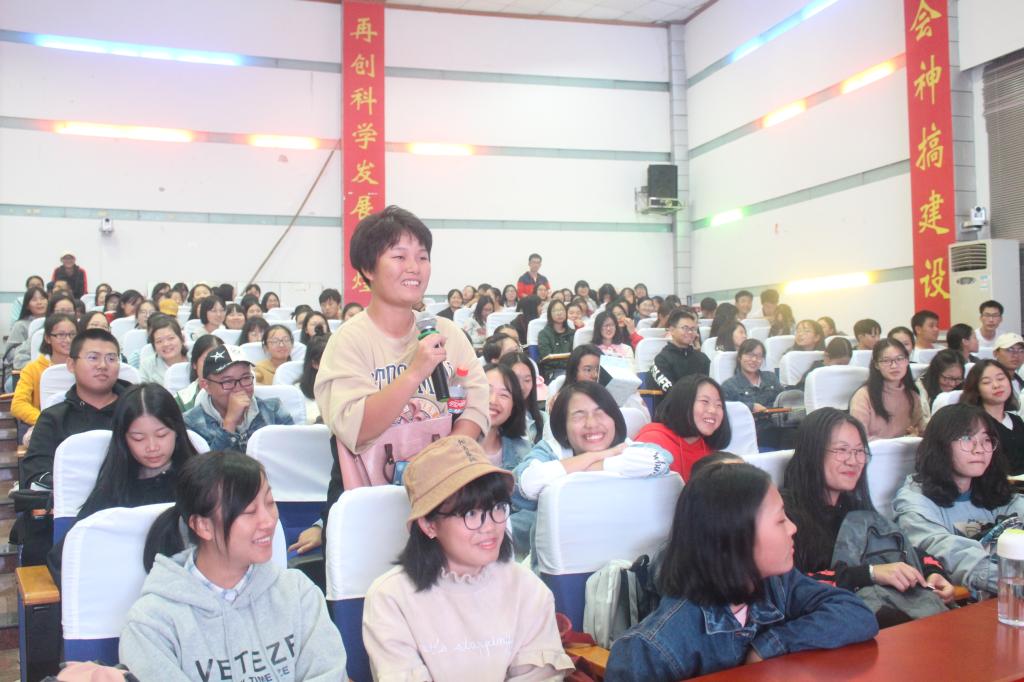 接着,她讲述活出全新的自己之“连融”问题:从人生成长的主要阶段及在系统中连融的主要内容,即正确处理“与父母的关系、与自己的关系、与他人的关系”。她强调,良好的人际关系和在集体中的沟通能力影响着大学生形成和发展健康的个性品质。为了让同学们更切实体验在大学生活中“连融”的重要性,老师邀请了两名同学上台示范“讨好、指责、依靠、关注”等四个两两互动的动作,并鼓励台下的同学勇敢地向旁座的同学进行这个互动活动,现场积极热烈,各班同学争先分享自己的体验与感受。