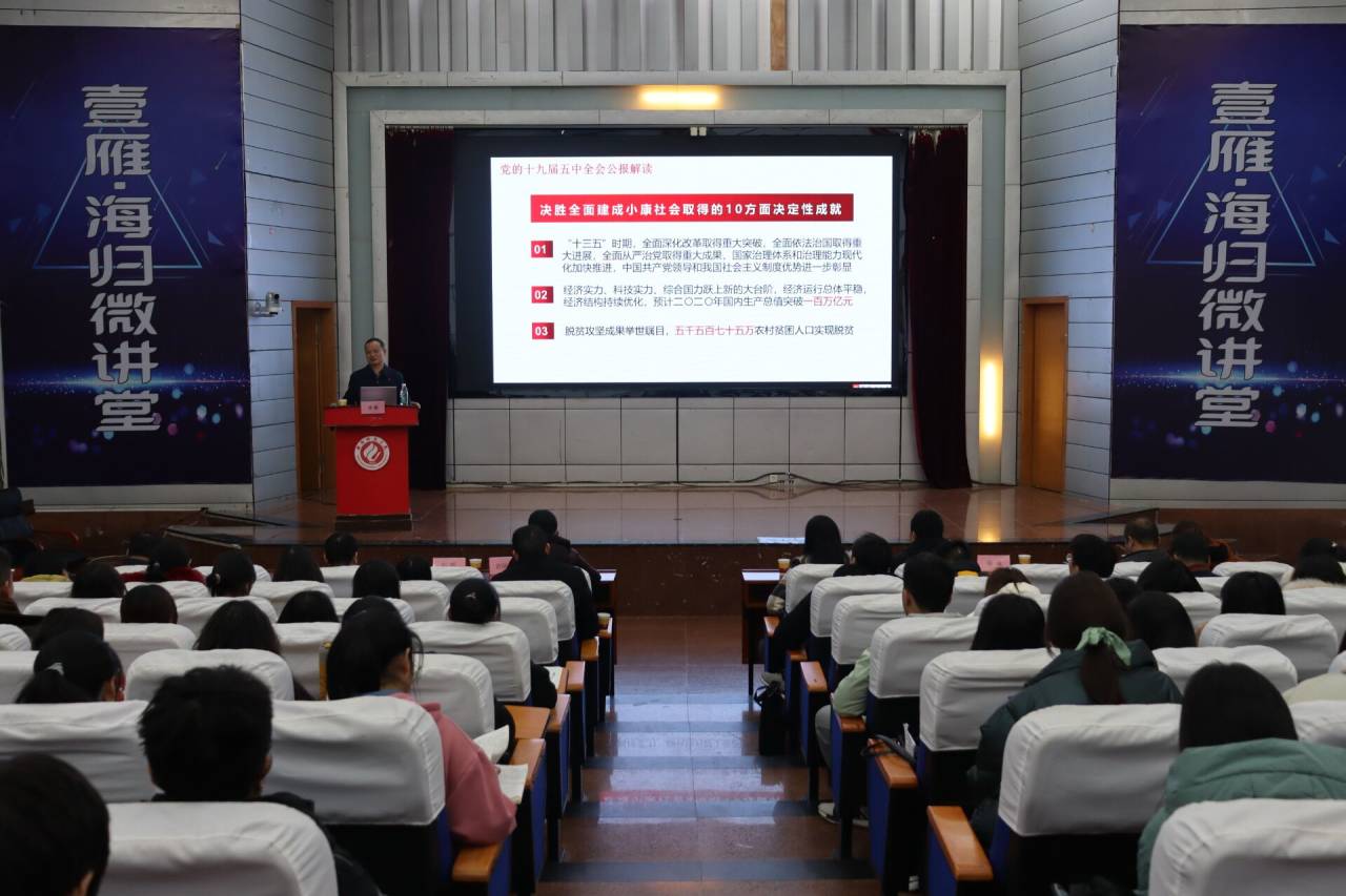 陈校长从“十九届五中全会公报解读”、“以高质量发展为主题的必要性”、“学校发展面临的机遇与挑战”、“把高质量发展的主题落到实处”四个方面开讲。党课伊始,陈校长便围绕习近平总书记在党的十九届五中全会上的重要讲话精神,从“一个重要判断”、“决胜全面建成小康社会取得的10个方面决定性成就”、“我国发展环境面临的深刻复杂变化”等多个方面,对党的十九届五中全会精神进行系统讲解和深入解读。