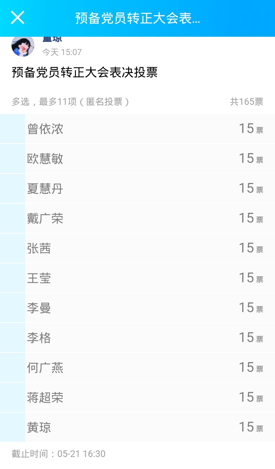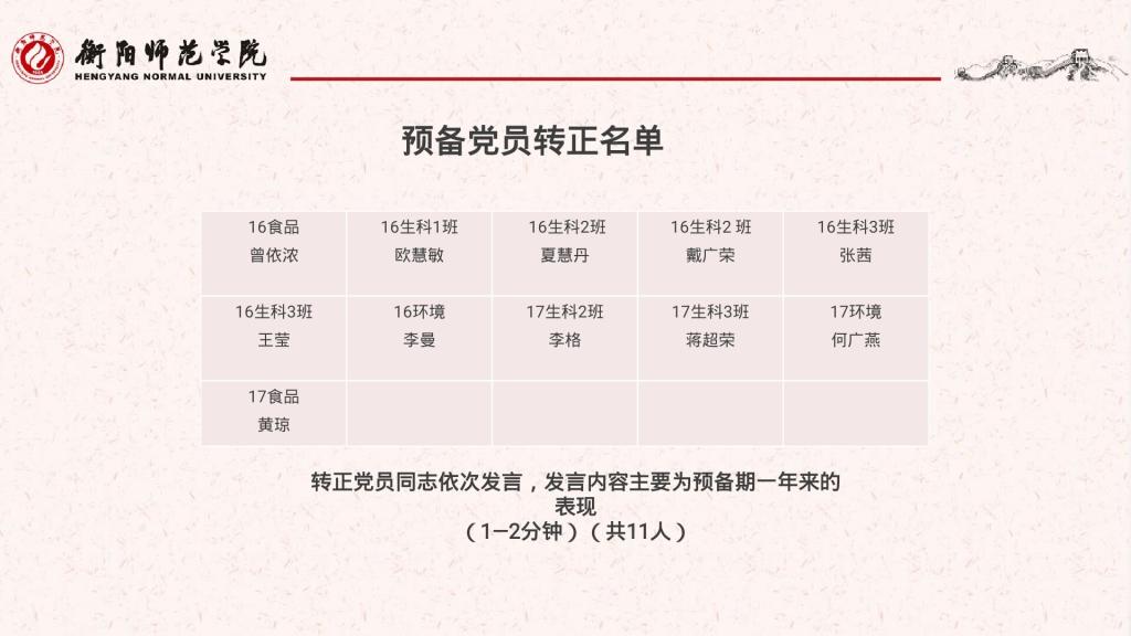 随后,预备党员的入党介绍人就以上11位同志能否转正进行讨论,杨海院长认为预备党员王莹在预备期不仅工作认真负责,在学习上也严格要求自己,前不久以411分的成绩考上了浙江师范大学,能做到知行合一。他对王莹同志转为正式党员表示支持,并希望她研究生阶段能更进一步,做出更好地成绩。经过各位正式党员的讨论,最后我院欧慧敏、夏慧丹等11位预备党员以13票赞成,0票反对,0票弃权顺利转正。