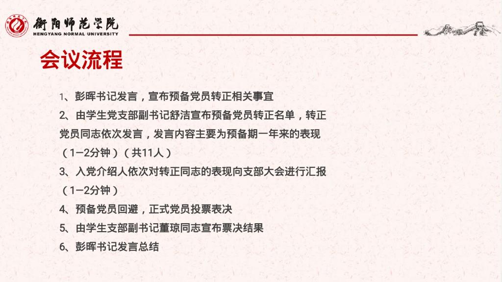 会议伊始,学生党支部书记许若霏宣布预备党员转正相关事宜。她表示,希望在疫情期间各位党员同志能够克服时间紧、人手不足的困难,高质量的完成后续的转正工作。