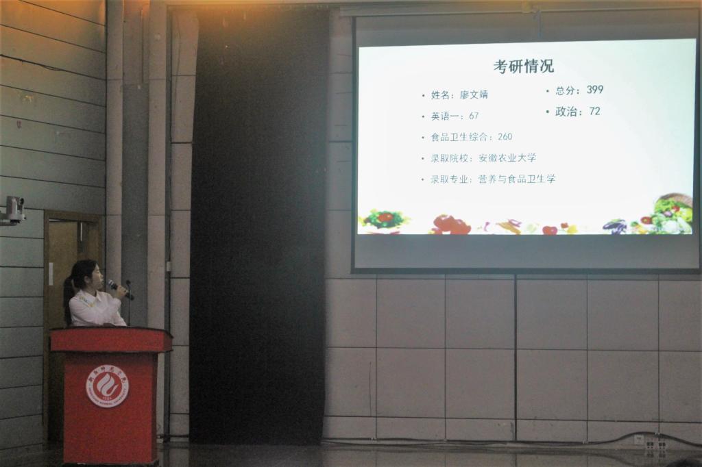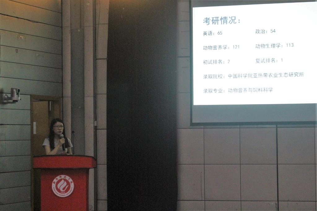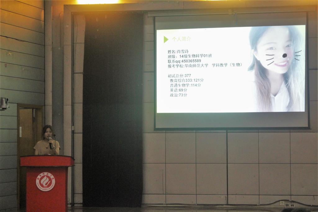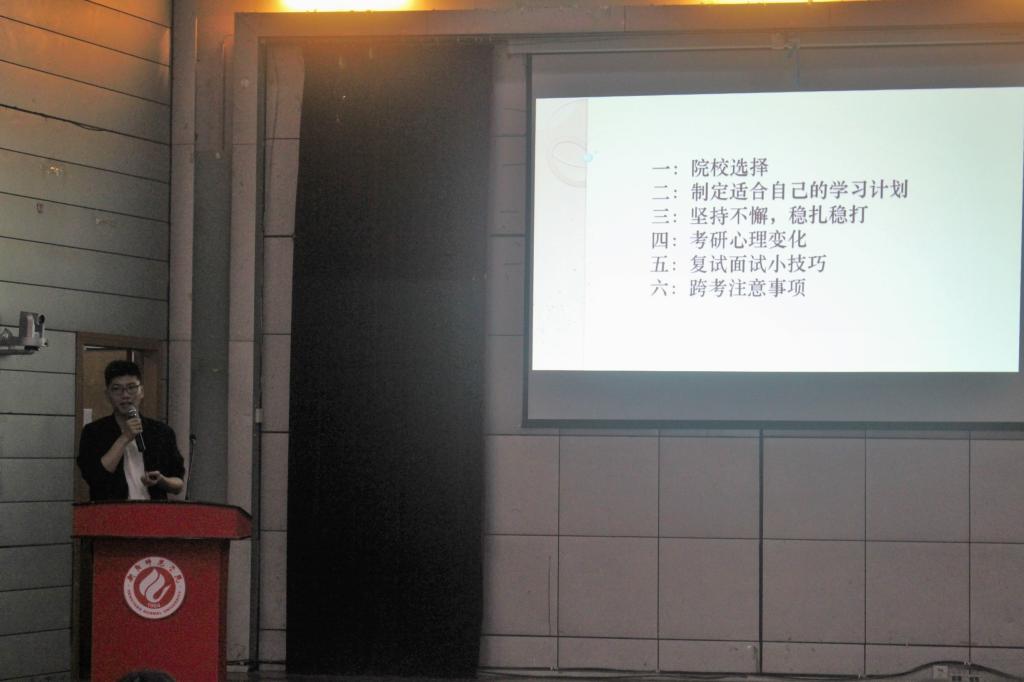 而后,2014级王鹏辉(考取浙江理工大学)、杨颖(考取暨南大学)、李玉玲(考取中南大学)、肖雪诗(考取华南师范大学)、廖文静(考取安徽农业大学)、苏文璇(考取中国科学院)六位优秀学生代表分别就当下考研形势、考研目的、初试各科目的时间安排、面试中的相关技巧等方面和大家进行了分享,期间并畅谈了他们的心路历程,在互动环节中,同学们积极主动地提出自己的疑惑:“如何调整考研期间的作息时间”、“如何了解和选择报考学校以提高考研成功率”、“如何利用暑假这个重要的时间段来提高自己的学习效率”等,针对这些问题,老师与学长、学姐们结合自己的实际经验与同学们进行了耐心细致的交流。准确实用的信息、亲切风趣的话语博得了现场同学们的热烈掌声。会后,大家互留了联系方式,以便更加详细深入的沟通。