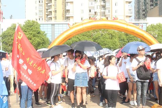 上午八点半,徒步活动从船山公园广场出发,沿长丰大道步行到蒸水河南堤,再沿蒸水河南堤步行到达终点石鼓书院广场,全程9公里。参加活动的徒步人员将近1000人,统一穿着印有“美丽衡阳,我是行动者”的文化衫,分四纵队行进。徒步途中,我院志愿者们不畏烈日,他们或高举旗帜,或手持横幅,为公益环保作宣传。