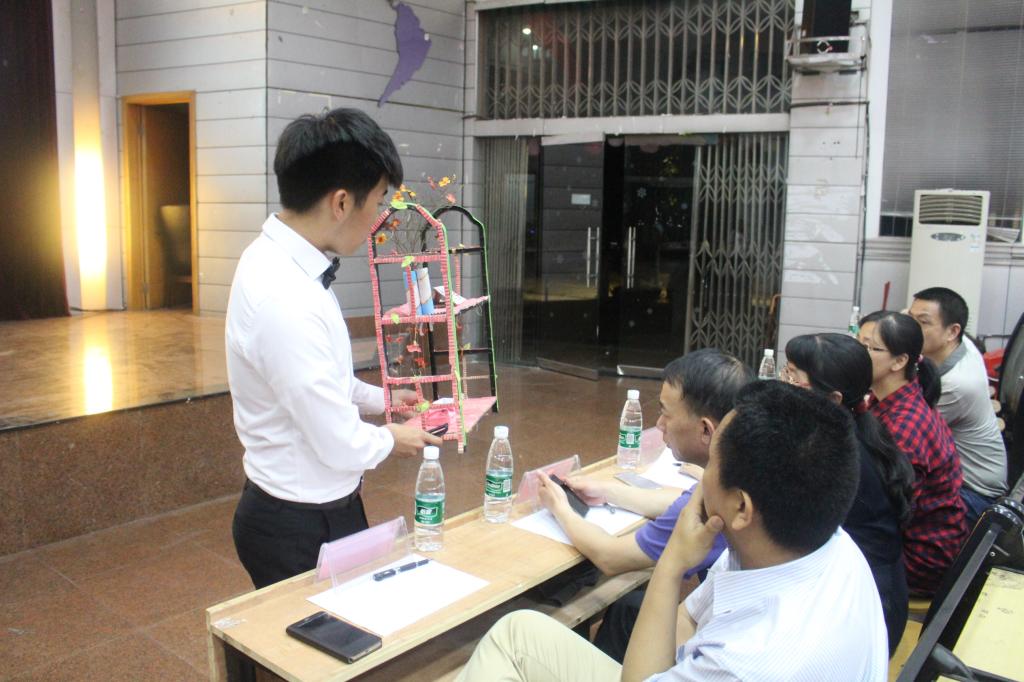 此次比赛分为作品展示、现场答辩、评委提问三个环节。参赛队伍从设计理念、使用性能等方面对自己的作品做了详细的介绍。评委从环保、美观、创意构思等角度对同学们的作品一一评分。旧快递盒、废弃瓶盖、毛线、铅笔屑等人们随意丢弃的废旧物,在学生的巧手中摇身一变成为精美的工艺品。糖果盒与旧格子布制成的精美储蓄罐,旧木板上创作的毛线画,快递盒、废弃墙纸结合制成简易书架,废旧牛仔裤裁剪成别致的小挎包,用铅笔屑粘合而成的跳舞姑娘,各种精美的小制作无一不让在场的评委与观众惊叹其奇思妙想。每件作品还附上设计理念与过程,让参观者能清楚地了解到这些漂亮的手工艺品是如何变废为宝的。最终,16号选手陈金未的作品“晾衣小花架”在一众优秀的作品中脱颖而出,摘得桂冠。