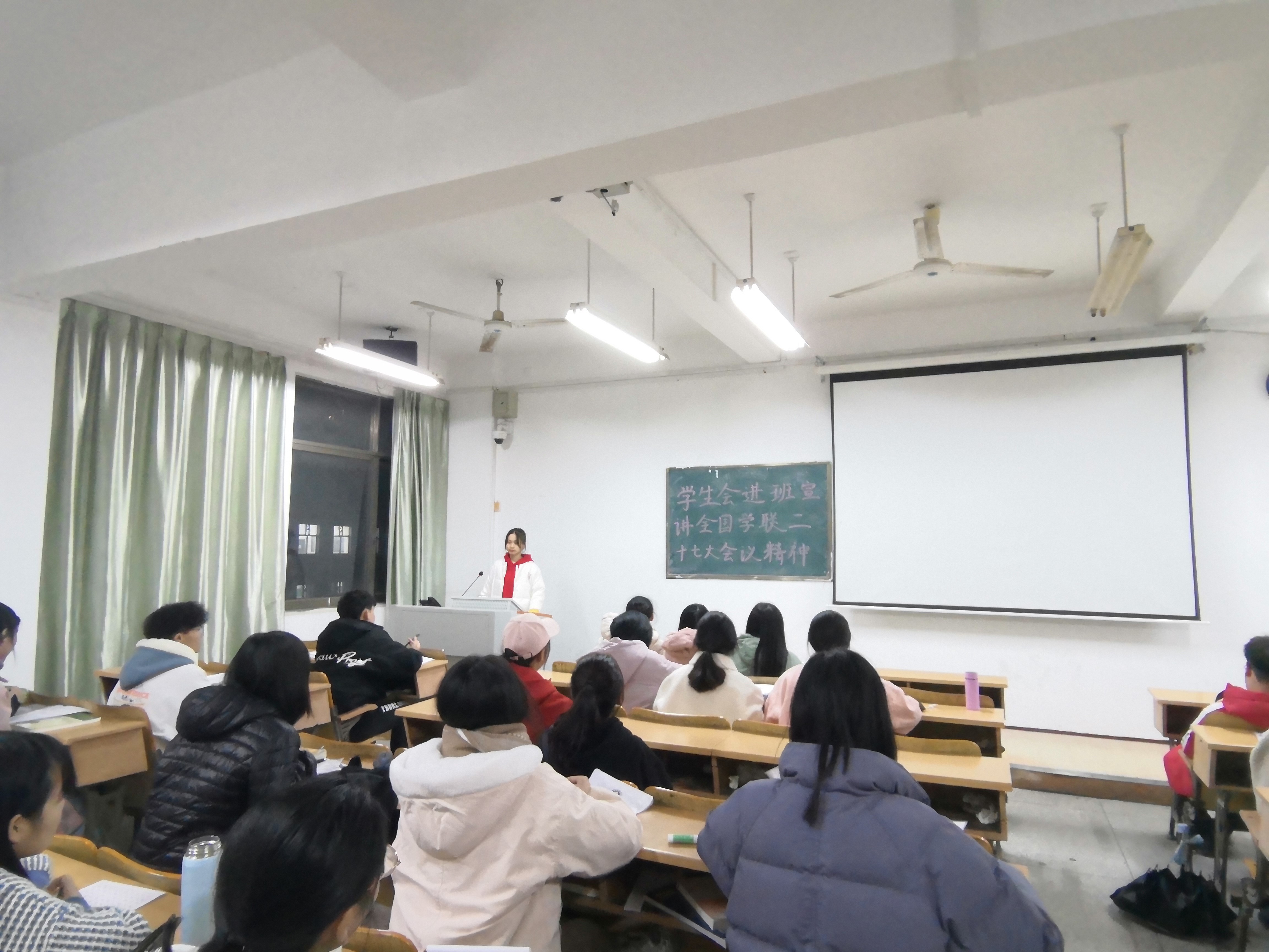 为深入学习贯彻全国学联二十七大、习近平总书记贺信和党中央致词精神,进一步凝心聚力、拼搏奋进,不断推进我校学生会组织深化改革,11月24日晚19:00,我院学生会成员进班宣讲学联二十七大会议精神,19、20级全体同学参与此次学习。