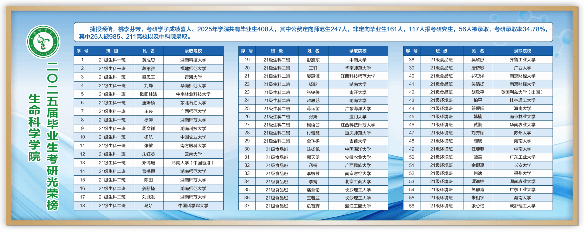 捷报频传,桃李芬芳,考研学子成绩喜人。2025年学院共有毕业生408人,其中公费定向师范生247人,非定向毕业生161人,117人报考研究生,56人被录取,考研录取率34.78%,其中25人被985、211高校以及中科院录取。