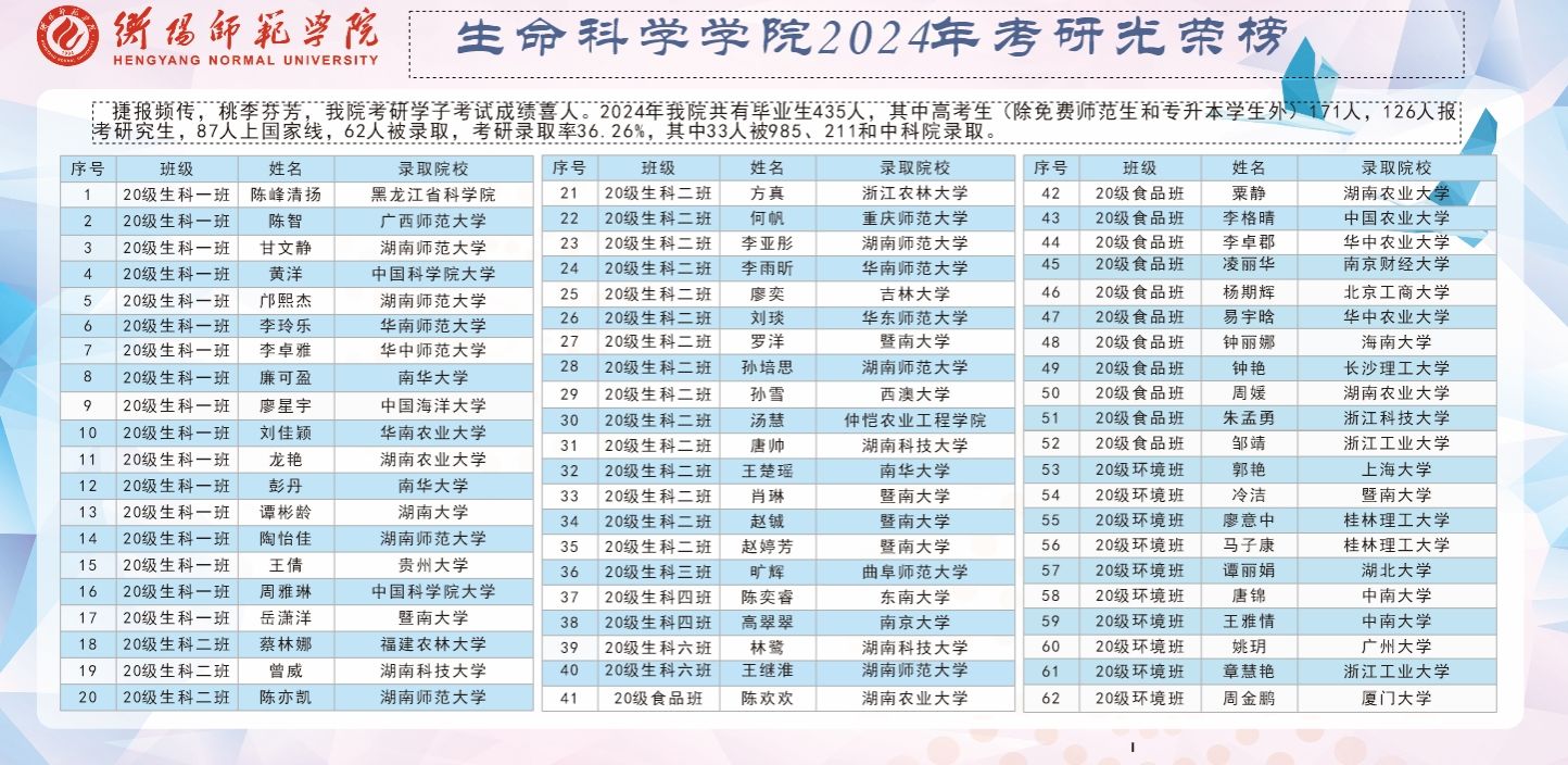 捷报频传,桃李芬芳,我院考研学子考试成绩喜人。2024年我院共有毕业生435人,其中高考生(除公费定向师范生和专升本学生外)171人,126入报考研究生,87人上国家线,62人被录取,考研录取率36.26%,其中33人被985、211和中科院录取。